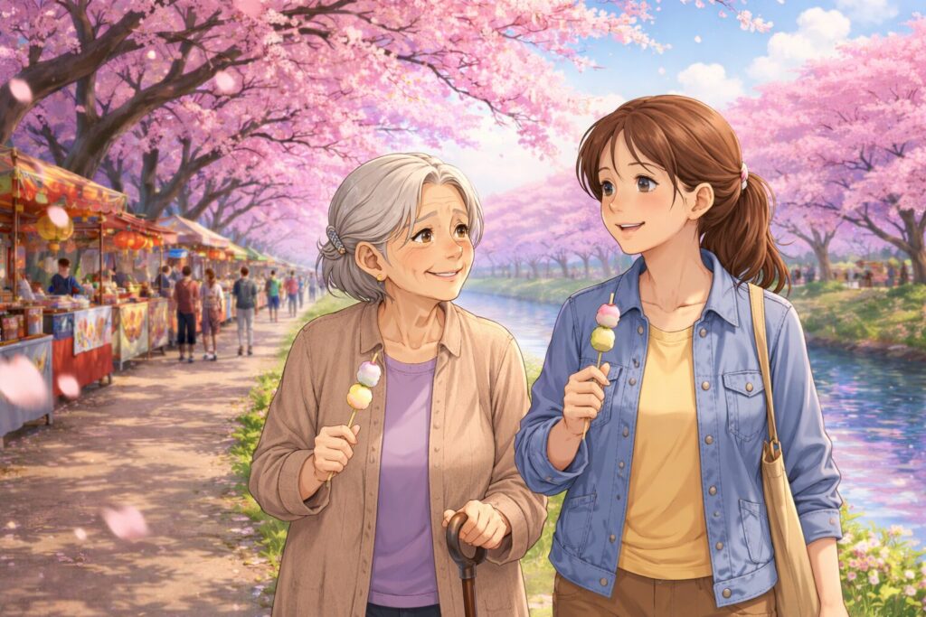 およそ20年ぶりに、母と並んで桜を見上げました。土手沿いは大勢の人でにぎわい、露店の甘い香りが漂っています。私たちはお団子を頬ばりながら、ゆっくりと歩きました。