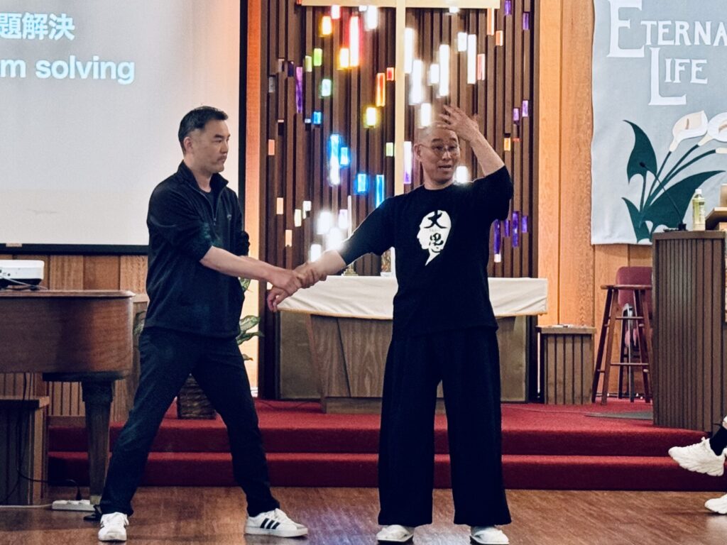 さらに、別のワークでは、両腕を上げるだけで、仏教でいう「正しさ」を体感できるワークを行いました。片腕の向きを変えるだけで腕の長さが変わる実演では、あちらこちらから歓声が起こりました。